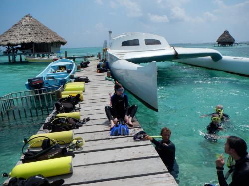 Am nächsten Morgen brachte uns Elvins Frau nach Sittee River zum Glovers Guesthouse wo der Transfer zum Glovers Atoll um 10 Uhr starten sollte. Wir trafen auf einen bunten Haufen: 4 Taucher aus Basel, eine russische Familie aus Meeresbiologen (Mutter, Vater & Tochter!), ein junges Pärchen aus Vancouver und ein älteres aus Maine. Nachdem der große Katamaran endlich beladen war ging es unterbrochen von einem kleinen Tankstopp los, 3 Stunden über das ruhige Meer.