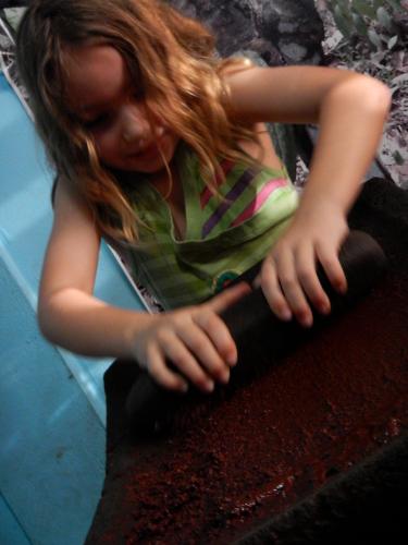 Wir wohnten bei Gregorio in den Tutzil Nah Cottages. Gleich am ersten Tag besuchten wir die Kakaoplantage und die Schokoladen-Fabrik im Ort. Dort lernten wir Schokolade herzustellen wie die alten Maya: die fermentierten, getrockneten, gerösteten und geschälten Kakaobohnen werden auf einem flachen Mörser aus Stein mit körperlichem Einsatz unter Zugabe von Zucker zu flüssiger Schokolade zerrieben.
