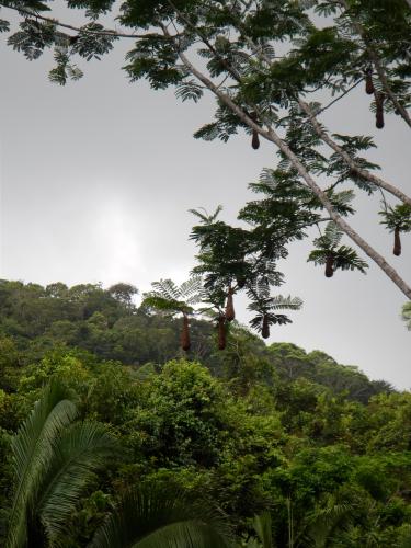 Nach anfänglichem Ekel hat Luzi entdeckt, wie lecker diese Hülle schmeckt und alle Bohnen abgelutscht! Mit Gregorio machten wir am folgenden Morgen beginnend bei Sonnenaufgang eine Wanderung durch den Dschungel des "Jaguar Reserve" des Cockscomb Basin.